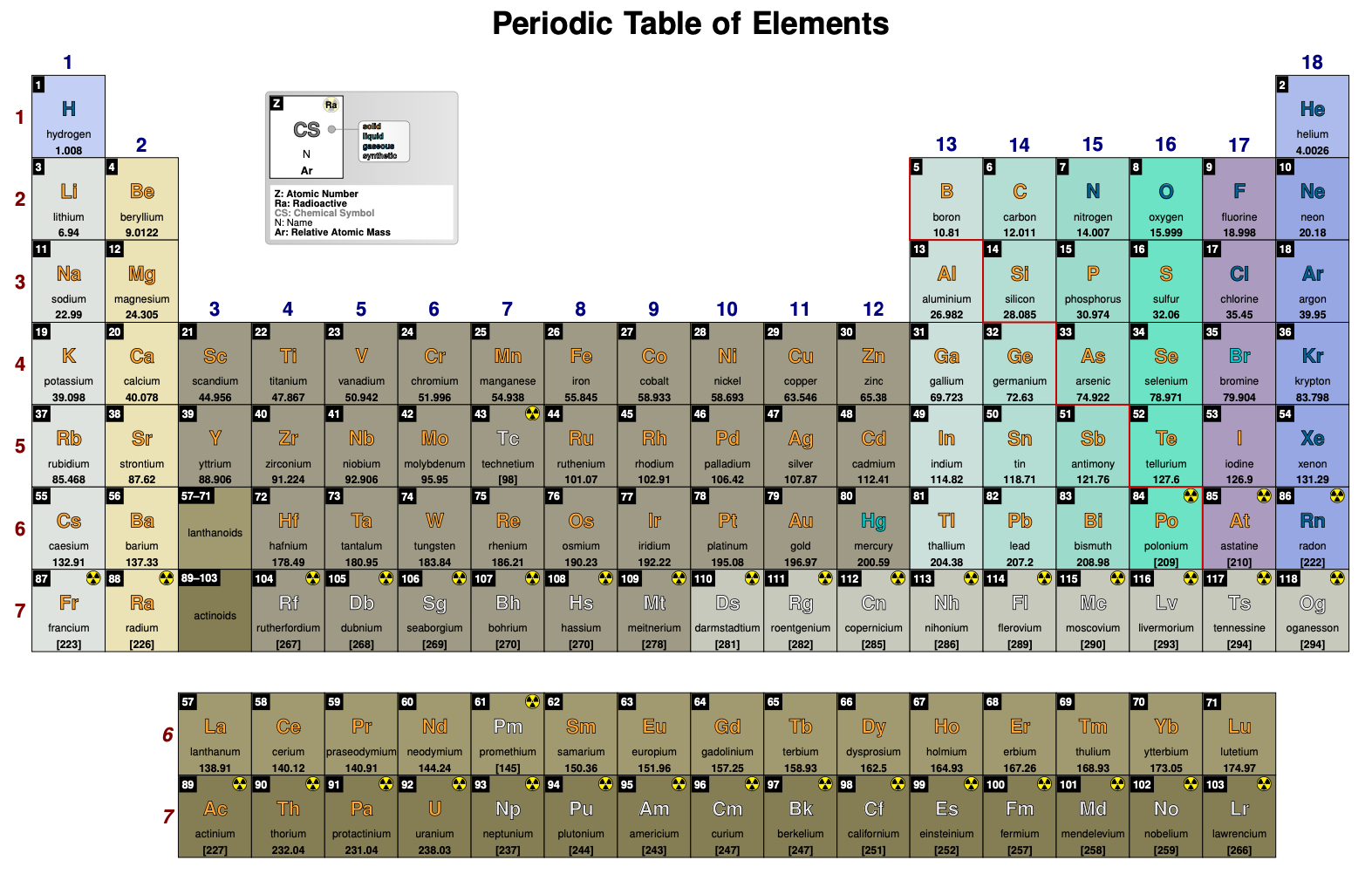 この表は、元素を族や周期に分類するための視覚的なツールとして、化学者や学生にとって不可欠です。金属、非金属、半金属を素早く見分けるのに役立ち、電気陰性度、原子半径、イオン化エネルギーといった性質が周期表の横方向および縦方向にどのように変化するかを理解する助けになります。